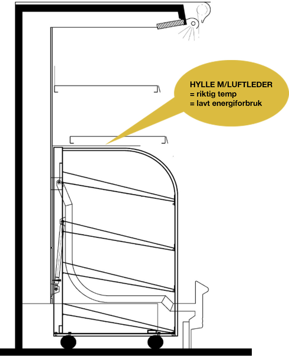 Luftleder hyllene er plassert 125 – 140 cm. over gulvet. ( se bilde under). Dette begrenser høyden på traller og andre salgs displayer. For å kunne sette inn traller med 5 og 6 hylleplan må luftleder fjernes. VIFCO trallene leveres med integrert luftleder som gjør det mulig å fjerne integrert luftleder. Med traller fra VIFCO er temperatur, luftsirkulasjon og energiforbruk tilnærmet lik en standard disk.