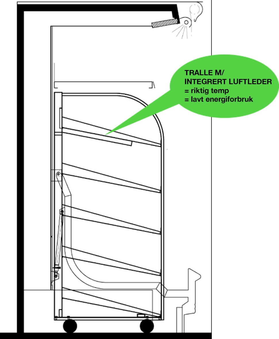 En tralle med integrert luftleder gir riktig temperatur, som gir lavt energiforbruk. Traller med 5 eller 6 hylleplan kan ikke plasseres i frontlastere uten at hylle med luftleder fjernes. Dette krever spesial utviklet tralle med integrert luftleder for å sikre riktig temperatur.